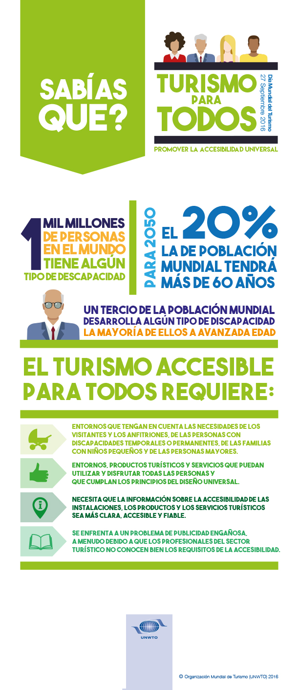 Turismo para todos: personas con discapacidad, ciudadanos de tercera edad y familias que viajan con niños. Éstos son sólo algunos de los grupos que requieren de accesibilidad universal, aunque todos los ciudadanos se benefician de alguna manera de las ventajas de entornos accesibles y servicios en turismo y otros sectores. Este argumento es el que da soporte al tema del Día Mundial del Turismo 2016, centrado en el turismo accesible. Las celebraciones oficiales tendrán lugar el 27 de septiembre en Bangkok, Tailandia.